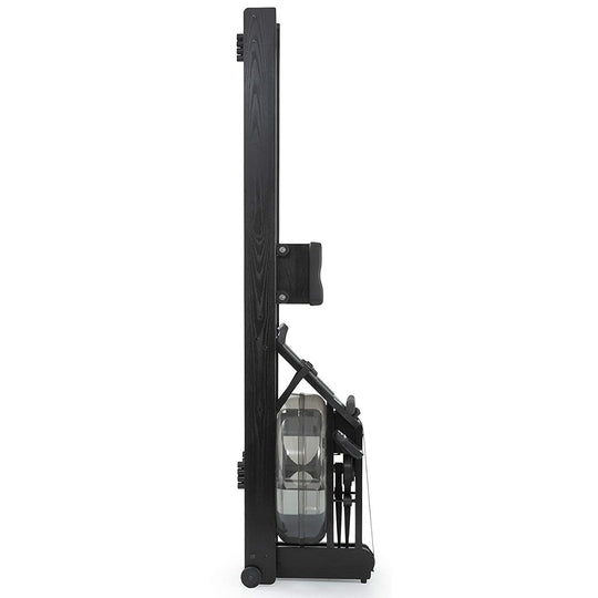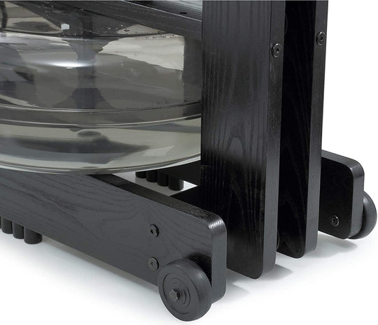 - Space Saving: Stores conveniently upright in about the space of a dining room chair. The WaterRower’s light wooden frame, the positioning of the WaterFlywheel close to the wheels, and the leverage effect provided by the rails make lifting almost effortless.